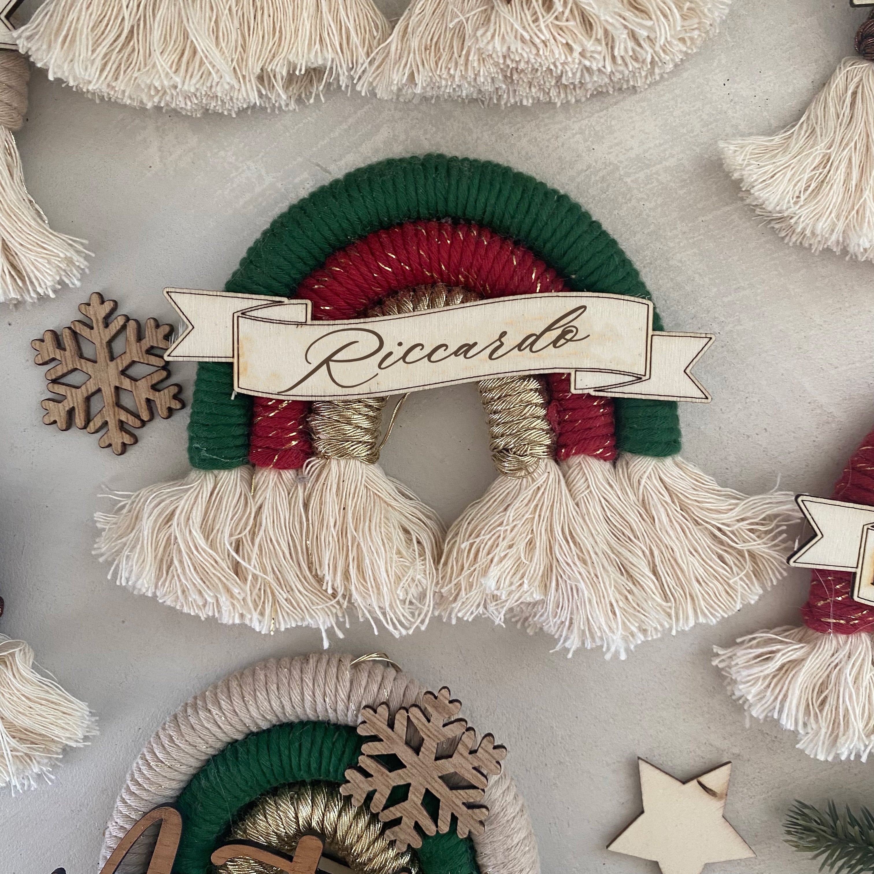 Decorazione natalizia unica e artigianale: addobbo per albero di Natale a forma di arcobaleno in cotone macramè, realizzato a mano e personalizzabile nei colori e con nome o scritta su legno, intagliato o inciso.