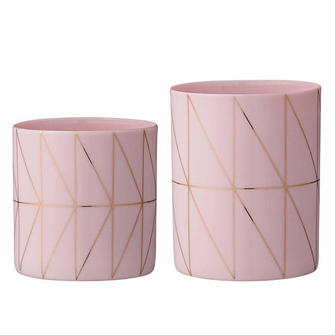 Vaso di Bloominville in porcellana grigia o rosa da appendere al soffitto, ad una mensola o a un gancio al muro grazie al supporto di corda naturale. Il vaso ha un'originale texture sfaccettata ed è reso ancora più originale dai decori in legno della corda.